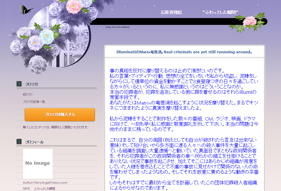 石原真理子のブログ(7月31日の画面)http://fairyangelvictory.blog83.fc2.com/