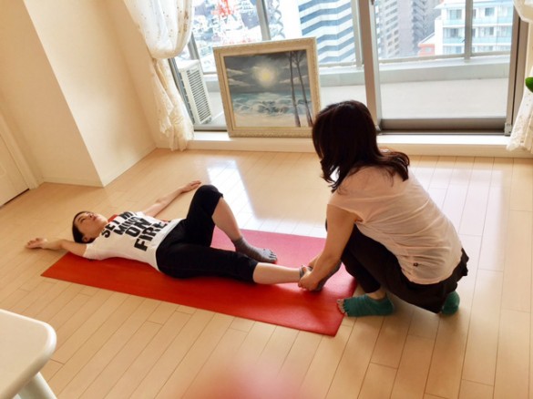 2)今度は、深く息を吐いていく。お腹をぺちゃんこにし、腰をヨガマットに着け、膝をとじる。