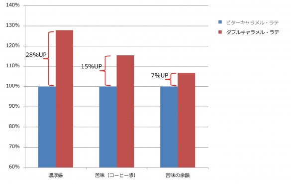 新商品「ダブルキャラメル・ラテ」(赤い線)のほうが、明らかに「濃厚感」「苦味(コーヒー感)」「苦味の余韻」が増しています。それを棒グラフにしてみると、特に「濃厚感」は28%の大幅アップ。