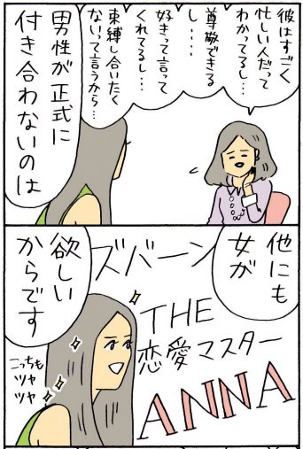 これに対して、ANNAさんは「男性が正式に付き合わないのは、他にも女が欲しいから」と、私達が一番認めたくない解答をズバリ指摘します。正直私も、このケースを読んで平行線の未来しか待っていない気がします……。