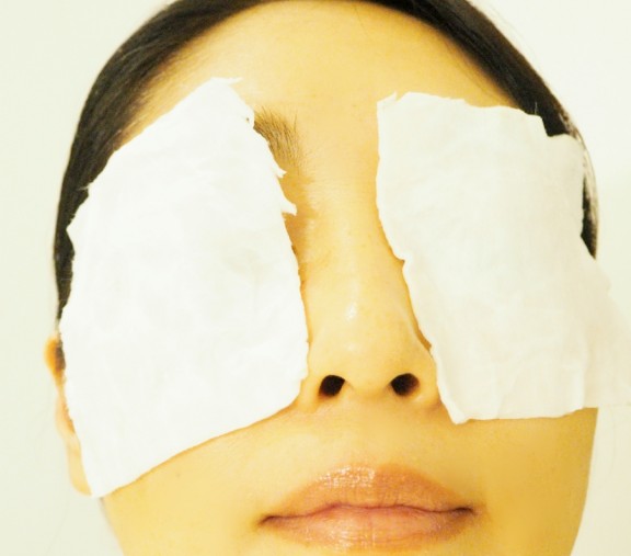 目と眉毛をすっぽりと隠すぐらいの大きさのコットンがない場合はペーパータオルでも可。