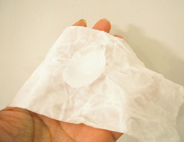 コットンを人差し指と小指にはさみ、顔全体をやさしくパッティングします。ペーパータオルの場合はたたんで使いましょう。