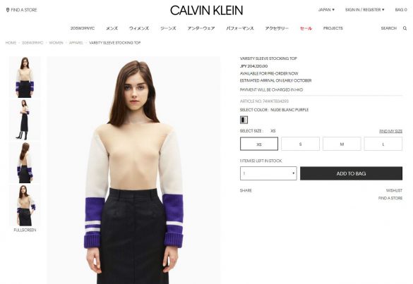 カルバン・クライン公式サイトより http://www.calvinklein.com/jp/varsity-sleeve-stocking-top-74WKTB34.html?dwvar_74WKTB