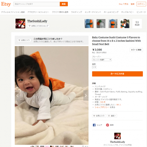 販売サイトより https://www.awin1.com/cread.php?awinmid=6220&awinaffid=257137&clickref=&p=https%3A%2F%2Fwww.etsy.com%2Flisting%2F461205054%2Fbaby-costume-sushi-costume-5-flavors-to