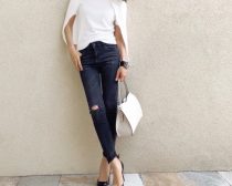 「上品なクルーネックを選んで、えりもとにはあえて小物を足さずに、クリーンな印象に仕上げています。そこにあえてダメージジーンズを合わせることで、こなれ感が生まれます」