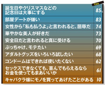 「セックスできなくても、喜んでもらえるならお金を使ってもまあいいか」(61%)、「安全日だと言われると真に受ける」(70%)という人のよさも。詰めの甘さと計画性のなさを感じないでもない。