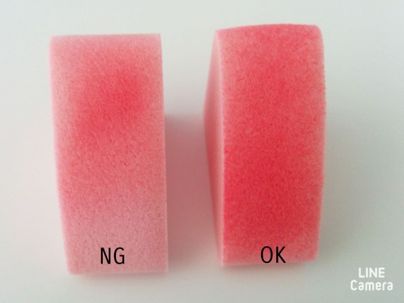 スポンジの塗布面全体に薄く色がつくぐらいにやさしくとります。スポンジの一部分だけだと、チークが肌に均一にのらないので注意しましょう。