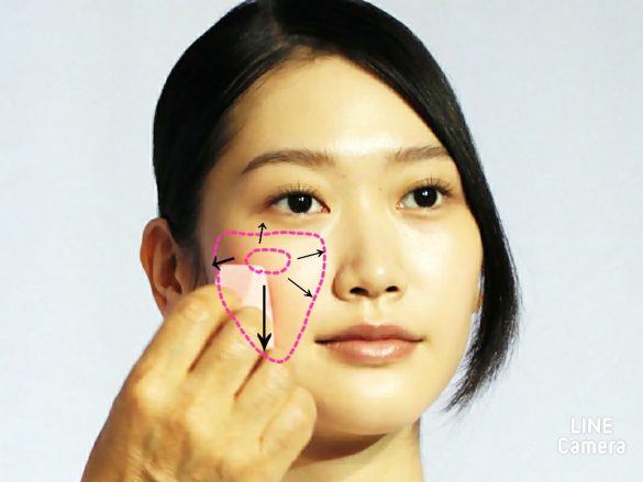 2. 頬骨の高い位置から、外側に向かってスタンプ塗りをする