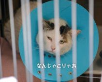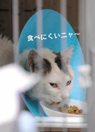 手術が終わり、ぽーは首に大きなエリマキ(エリザベスカラー)をつけられてしまった。これは手術した傷口を舐めないための措置だ。