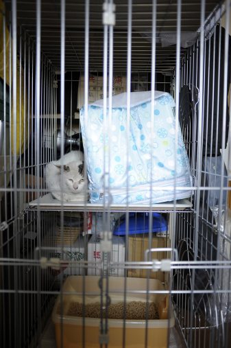 人間の狡猾な策(おいしいご飯)によって捕獲器に入り、囚われの身となったぽー。私のTNR(※)第一号として、まずはケージ生活に入る。