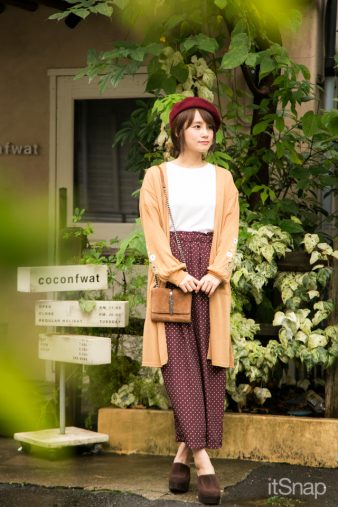 色気あるクールな女性を演出するレザースカート⇒【写真】はコチラ https://joshi-spa.jp/?attachment_id=792441 モデル、タレント 野村日香理サン(165cm) 足元と合わせたアースカラーのバッグはトレンドのスエード素材。ほどよく大人っぽい雰囲気で洒落感を誘います。ちょいレトロな印象のドット柄のパンツとベレー帽。秋色満載の今しかできないスタイリングです。 花柄刺しゅうニットカーディガン&Tシャツセット 約¥4,000 ドット柄ガウチョパンツ 約¥4,000/chocol raffine robe ショルダーバッグ/ZARA 厚底スリッポン 約¥10,000 ベレー帽 約¥3,000/w closet (アイテム、価格はすべて本人申告)