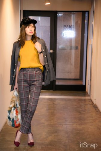 人と差をつけるならマスタードイエローのファーアウター⇒【写真】はコチラ https://joshi-spa.jp/?attachment_id=792444 モデル、シンガー 東紗枝サン(163cm) シックに見えがちなジャケット×パンツコーデにニットとファーバッグで色味を追加! 着こなしを盛り上げます。カラフルなファーバッグなど遊びを効かしたデザインが多いのもZARAの魅力。仕上げにレディなボルドーパンプスできちんと女度を足すことも忘れずに。 ジャケット 約¥40,000/HAN AHN SOON ニットTシャツ 約¥5,000/ZARA タータンチェック柄ストレートパンツ 約¥5,000 カラフルファートートバッグ 約¥6,000/ZARA スエードパンプス 約¥3,500/FOREVER 21 ベロアキャップ 約¥2,500/FOREVER 21 ストーンピアス 約¥2,000 レザーブレスレット 約¥3,000 (アイテム、価格はすべて本人申告)
