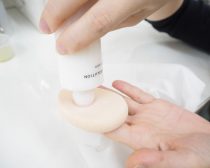 化粧水オイルをなじませたスポンジで、軽くおさえるようにして崩れた化粧をふきとります。Tゾーンや頬はスポンジで、アイメイクには化粧水オイルをなじませた麺棒を使って、メイクをオフします。