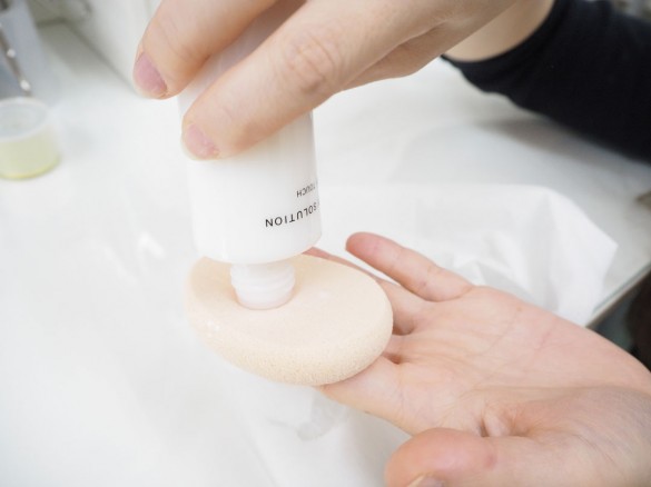 肌が乾燥しているときはリキッドやクリームファンデがおすすめですが、忙しいときはパウダーファンデが使い勝手がよいですよね。パウダーファンデについているスポンジをキレイに洗い、500円玉ぐらいの大きさを目安にオイル化粧水をスポンジにしみこませます。