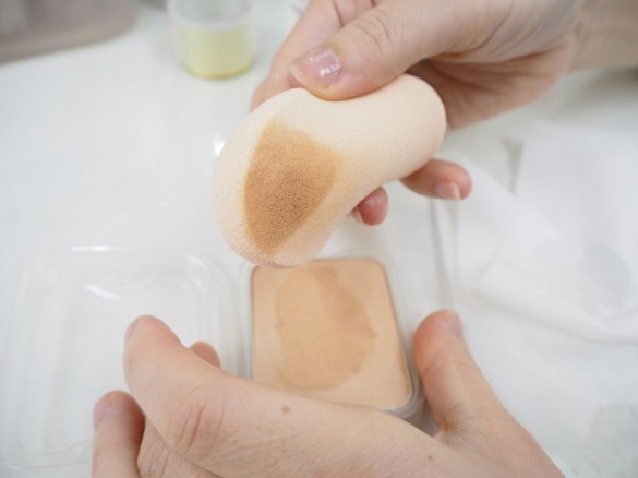 その後、オイル化粧水をスポンジによくなじませて、いつものようにパウダーファンデをとり、肌にのせましょう。粉っぽくならず、リキッドファンデのような仕上がりが完成しますよ。