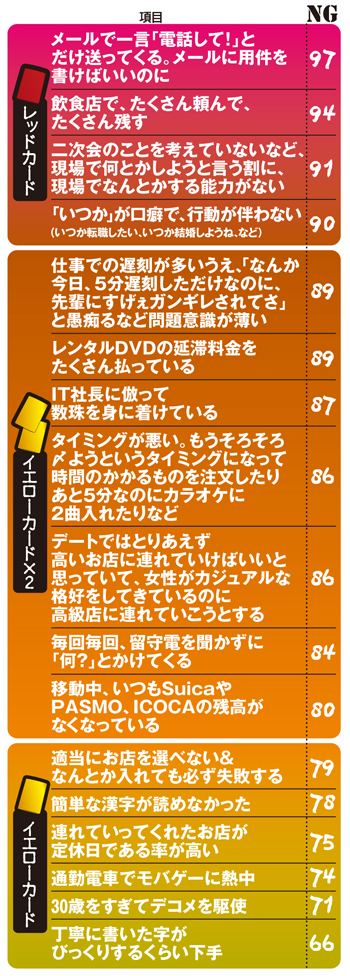 「『魂』を『かたまり』と読んだ男。この人のDNAはいらないと思った」(31歳・商社)に代表される「簡単な漢字が読めなかった」(78NG)、「通勤電車でモバゲーに熱中」(74NG)が「デキなさそう」なのはわかる。でも、これらより「二次会のことを考えていなかった」(91NG)や「タイミングが悪い」(86NG)のほうが不評なのは、実害があるからだ。