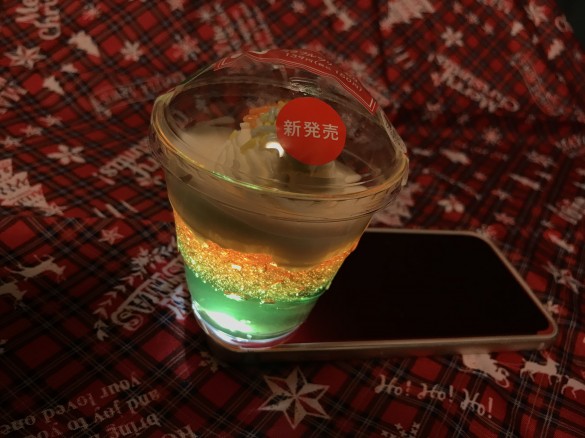 下からメロンゼリー、苺ゼリー、レモンムース、ホイップ、カラースプレーと層になっていて、クリスマスツリーを彷彿とさせます。ただ、暗めの色なので“カラフル”かと言われると……。うーん……といった感じ。