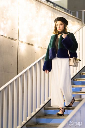 グリーン×ネイビーのバイカラー配色のファーコートはインパクト大☆