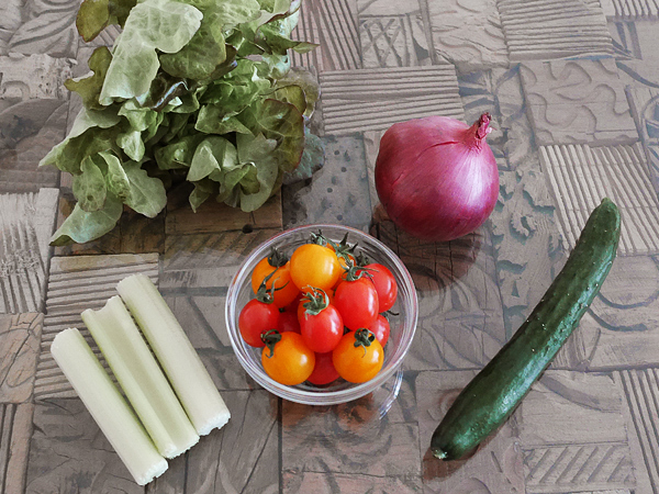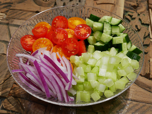 よく使われる食材は、トマト、キュウリ、紫玉ねぎの3つ。黒オリーブ(実)やピーマンを加えることも多いようですが、お好みのアイテム(ゆで玉子やサラダチキンだっておいしい!)を加えて楽しむのも良し。ここではセロリとレタスをチョイスしました。そして次に、味つけです。