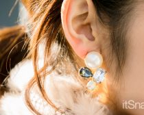 ピアスのパールに合わせて、インナーもパールつきニット。さらに顔周りがパッと明るくなりますね。