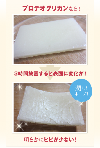こんな比較実験があります。プロテオグリカンとヒアルロン酸をお餅の表面に塗って、3時間放置。その変化を見てみると……。