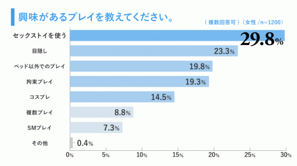 まず、「興味のあるプレイを教えてください」と質問をしたところ、「セックストイを使う」を挙げた女性が最多(29.8%)で、続いて「目隠しプレイ」(23.3%)、「ベッド以外でのプレイ」(19.8%)、「拘束プレイ」(19.3%)、「コスプレ」(14.5%)、「複数プレイ」(8.8%)、「SMプレイ」(7.3%)という結果に。