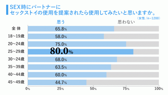 さらに、「セックス時に、男性からセックストイを提案されたら使用してみたいと思いますか?」という質問に対し、約7割の女性が「思う」と回答。パートナーからの一押しがあれば一緒にセックストイを使いたいと思う女性がかなり多いことがわかりました。