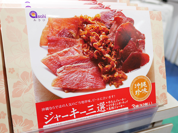 はじめにご紹介するのは、那覇空港の大きなお土産屋さんで「レトルト・肉部門」で人気ベスト3の「沖縄珍味 詰め合わせ」。黒糖と島唐辛子で仕上げた牛タンジャーキー、ピリ辛ミミガーチップ、島豚ジャーキーの2種が入った商品です。