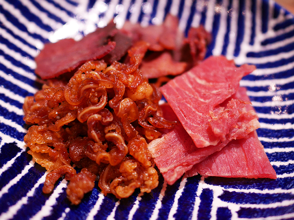 1つ1つが小箱に入っていて、そのままおつまみとして食べやすい形態になっています。そして3種を皿に移すと…