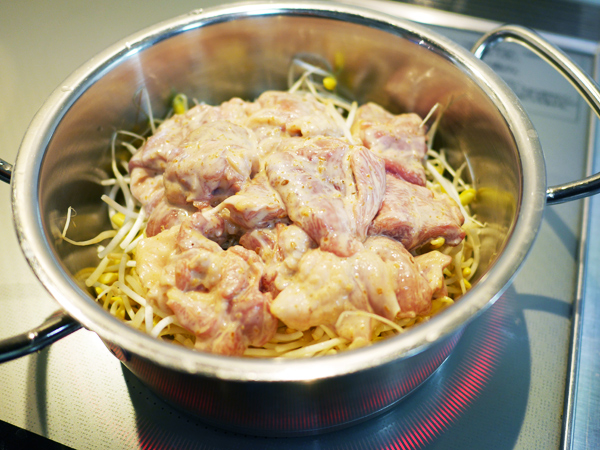 小鍋に豆もやしを敷き、水を少々(50~100ml)注いで、浸けた鶏肉を乗せてフタをして火にかけます。沸騰したら火を弱めの中火におとし、5分加熱。火をとめて3分そのままにすれば完成です。