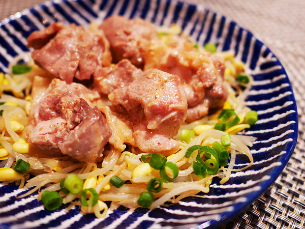皿に盛りつけ、青ネギをパラリと添えました。野菜はもやし以外でも良く、キャベツや小松菜などご自由に。