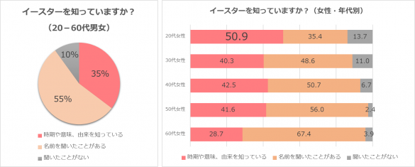 株式会社ぐるなびが20代~60代の会員を対象に実施したアンケートでは、イースターを「知っている」と答えた人は全体の9割。その中でも、イースターの「時期や意味、由来も知っている」と答えた人が最も多かったのは20代女性(50.9%)でした。