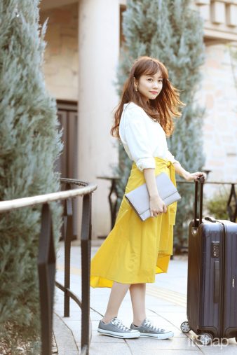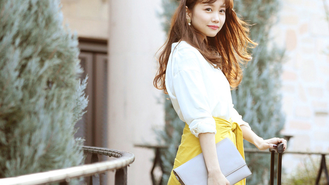 イエローを主役にした清潔感あるスタイリングは男女問わず愛されること間違いなし! 鮮やか過ぎない柔らかなイエローの色味をチョイスすることで、女性らしさが際立ちます。素肌の見え方がちがうヘムスカートでコーデに動きをプラス! 最後の仕上げに白シャツの腕をまくってこなれ感を出すのがポイントです。