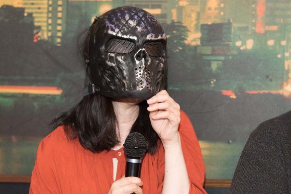 爪さんが元気のない理由は、「来場前に神社に参拝に行き、『このお願いは他人に見られないほうがいいだろう』という絵馬を裏返したりしていたら神主さんに叱られたから」とのこと。一方、こだまさんはご家族に内緒で作家活動をしているため顔出しNGで、人前に出るときは必ずマスクを着用しているのですが、今回のマスクはサバイバルゲーム用だという相当いかついもの。しょっぱなから独特のムードが醸し出されています。