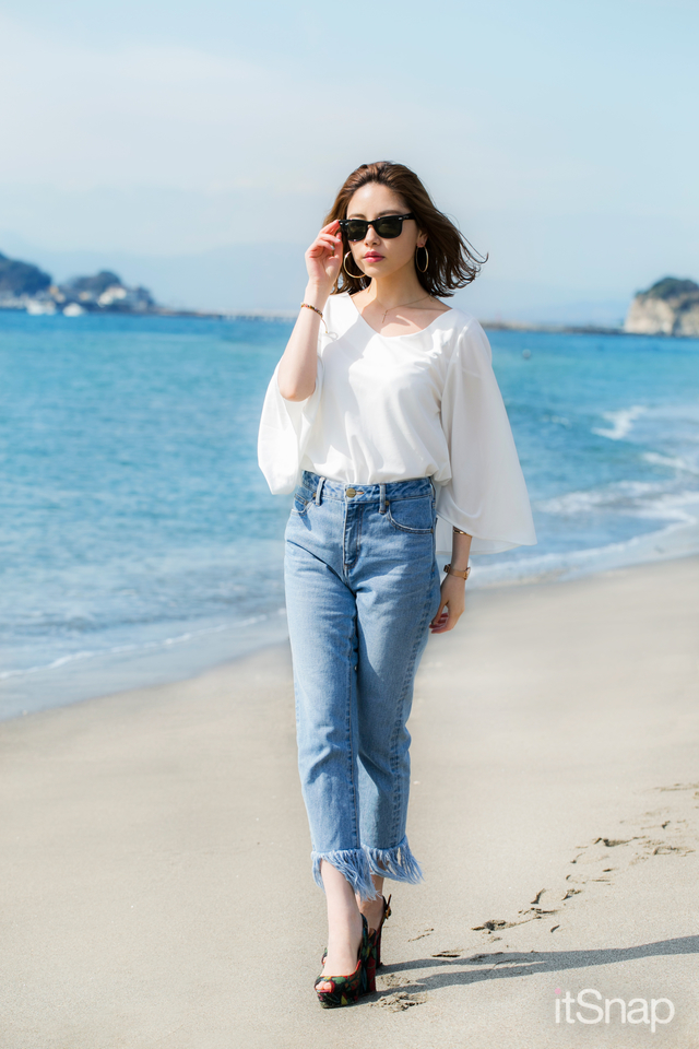 ラフな着こなしなのに色っぽさのただよう初夏の装い。白トップス×デニムパンツと王道の定番コーデですが、旬なアクセントを盛り込んでいるのでトレンド感満点。風になびくフレア袖ブラウスが、さわやかさを演出してくれます。