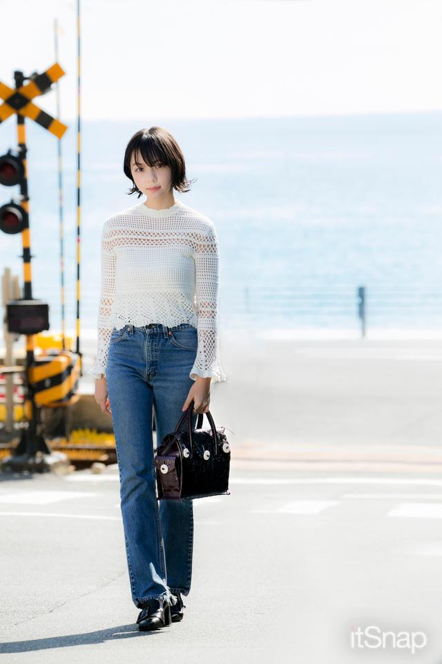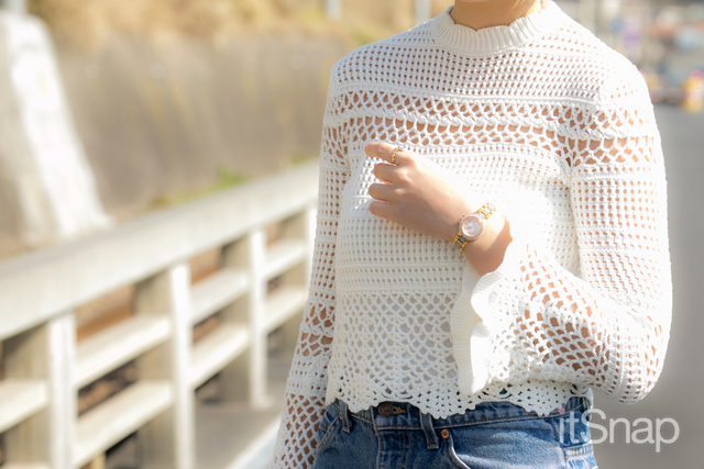 大人ガーリーなクロシェニットでデニムスタイルをフェミニンに
