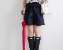 マリン風のシャツにハーフパンツ、そこに白いレインブーツを合わせています。傘を持っているわけではないので、必ずしも雨用という感じではないのですが、さりげなく、かつおしゃれにレインブーツを履いています。