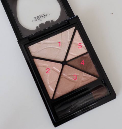 まず一番薄い1を眉下のところに広げます。指ですっと一番高いところに入れていきます。目のキワにいくに従って反時計回りに濃い色を使っていきますが、あまり入れすぎるとさわやか感がなくなるので4は二重の間に薄めに入れて。