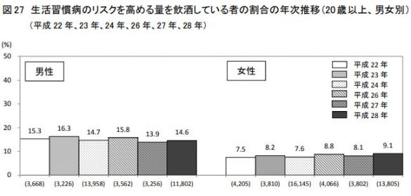 平成28年度の「国民健康・栄養量調査」(厚生労働省)によると、生活習慣病のリスクを高める量を飲酒している人の割合は、男性で 14.6%、女性で 9.1%と依然として男性が多いですが、平成22年からの推移を見ると、男性では有意な増減は見られない一方、女性では有意に増加しています。年代別には、男性では50代、女性では40代が最も高い割合を示しています。