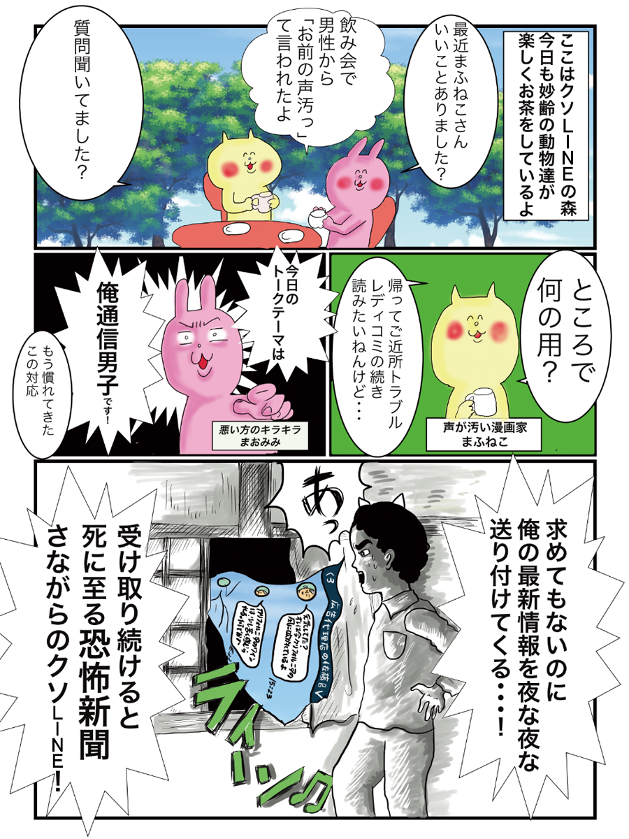 女性たちに届いた数々のLINEを漫画家・真船佳奈がいじりまくる「おいでよクソLINEの森」第3話。
