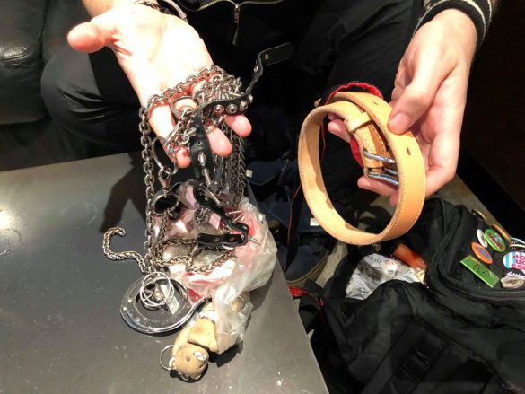いつもリュックに入れ持ち歩いているという「マゾパック」の中身。首輪や手錠、そしてなぜかSMの格好をしたクマの人形が入っている