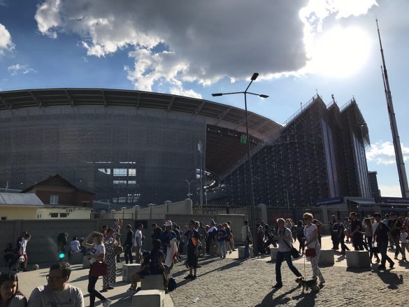 第2戦・セネガル戦の行われるエカテリンブルクはロシア第4の都市。  市内に「アジアとヨーロッパの境界線」が存在する、モスクワから1700kmも東側にある街です。  さすがにこの距離を列車で移動するのは厳しいので、今回は、観光のために訪れていたサンクトペテルブルクから、飛行機でエカテリンブルク入りすることにしました。  サンクトペテルブルクでの滞在は、「こんなに続くものか!?」というくらい予想外のトラブルの連続。  郊外にあるエカテリーナ宮殿のツアーを日本から申し込んでいたのですが、まずそのツアーガイドが現れずにホテルロビーで2時間待ちぼうけ。  仕方がないので自力でタクシーを飛ばしていったところ、宮殿に着く頃には嵐のような土砂降りに。この雨では観光もできないと判断して、そのままとんぼ返りしました。ドライブ代4000円なり…。 エカテリーナ宮殿 リベンジを果たそうとした翌日も、約束をしていたロシア人にすっぽかされて1時間待ちぼうけ。  そうこうしている間に友人のクレジットカードが機械に吸い込まれ、レセプションに相談したり電話をかけたりのトラブル対応。  やっとタクシーに乗れたと思ったら、今度は「やっぱり行き方がわからない」と道途中で降ろされる。えええええ、いまさらー!?  なんとか宮殿にたどり着いたものの、時間がなくて観光は一瞬で終了。そしてiPhoneを落として液晶にヒビが…。  その後行ったファンフェス(パブリックビューイングのある、W杯特設のお祭り会場)では次男がぐずりMAXで、周りの注目を集めまくり。誇張ではなく、めっちゃ混んでいるのに私たちの半径3mだけ人がいない…。しまいにはボランティアスタッフに「なにか手伝いましょうか?」と声をかけられる始末。ぐずりが半端なくてすみません…。  そして、「サンクトペテルブルクといえば!」という代名詞のエルミタージュ美術館へも、時間のなさと子どもの疲労で行くことができず。日本でチケット買ってたのに…しくしく。  でもそんなトラブルの応酬も、日本代表に降りかかる厄を代わりに引き受けたんだと思えば前向きに受け止められます。
