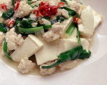 軽く水抜きした豆腐(1丁、絹ごしでも木綿でもOK)のさいの目切りと、ざく切りにしたニラ(半束)・ネギ(10cm程)を加えます。