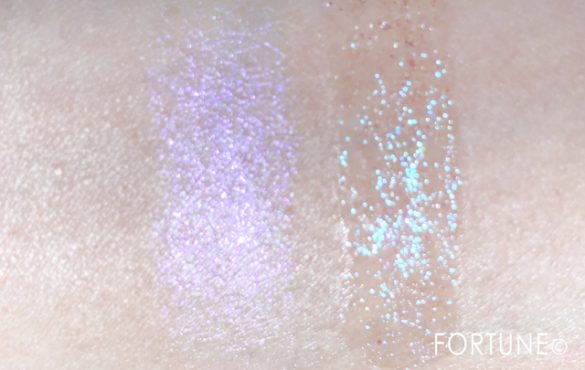 ユニコーンリップグロス MCCG1802は、ほとんど透明のベースカラーに青みのあるグリーンのラメがキラキラ輝きます。ボトルで見るよりも肌に出したらラメの密度は控えめ。