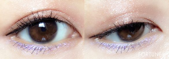 下まぶたに細くラインっぽく入れてみました。まるでクリームアイシャドウみたいな使用感でパールが飛び散らないから狙ったところにつけやすい! 強くこすったら取れてしまいますが、触らなければ色持ちも抜群です。アイメイクのワンポイントカラーとしてかなり使えます。