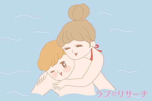 浮き輪を使って、ふたりで泳ぐという場合、どちらが浮き輪に入って、それの浮き輪を持つような形で泳ぐのが定番ですよね。そんなときは、足が届かないところまでいって、彼の身体に、足を絡めてみましょう。