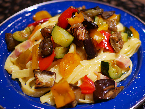 はじめにご紹介するのは、セブン-イレブンで購入可能な「冷凍グリル野菜」(税込213円)。ナス、ズッキーニ、パプリカを小サイズにカットして香ばしく焼いたものなのですが、これが期待以上の万能感なんです。写真は、チンしたグリル野菜をオリーブオイルで和え、冷凍カルボナーラの仕上げにトッピングするというアイディア。この他、レトルトカレーなどの王道メニューと合わせれば、無理なく“野菜たっぷり”を実現できます。