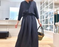 一見、ワンピースのようにも見えますが、上と下は分かれています。ルックの写真はインナーに薄手のニットのハイネックを合わせています。