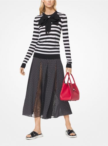 マイケル・コースコレクションで提案されているスタイル。大きなリボンのついた黒と白のボーダーのセーターに、深いスリット部分にレースを施した水玉のロングスカート ※マイケル・コースの公式HPより。https://www.michaelkors.com/polka-dot-silk-georgette-and-lace-skirt/_/R-US_104PKL106B