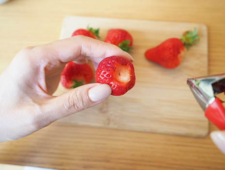 でもこれだったら、えぐってそこだけ刳りぬけるので、いらない部分だけ取れるんです。イチゴって、葉の部分を取っても芯が残るじゃないですか。